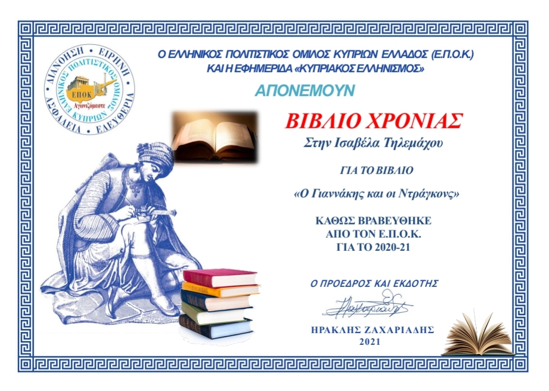 * Βραβείο Βιβλίου της χρονιάς 2019 από τον Ελληνικό Πολιτιστικό Όμιλο Κυπρίων Ελλάδος (Ε.Π.Ο.Κ.)